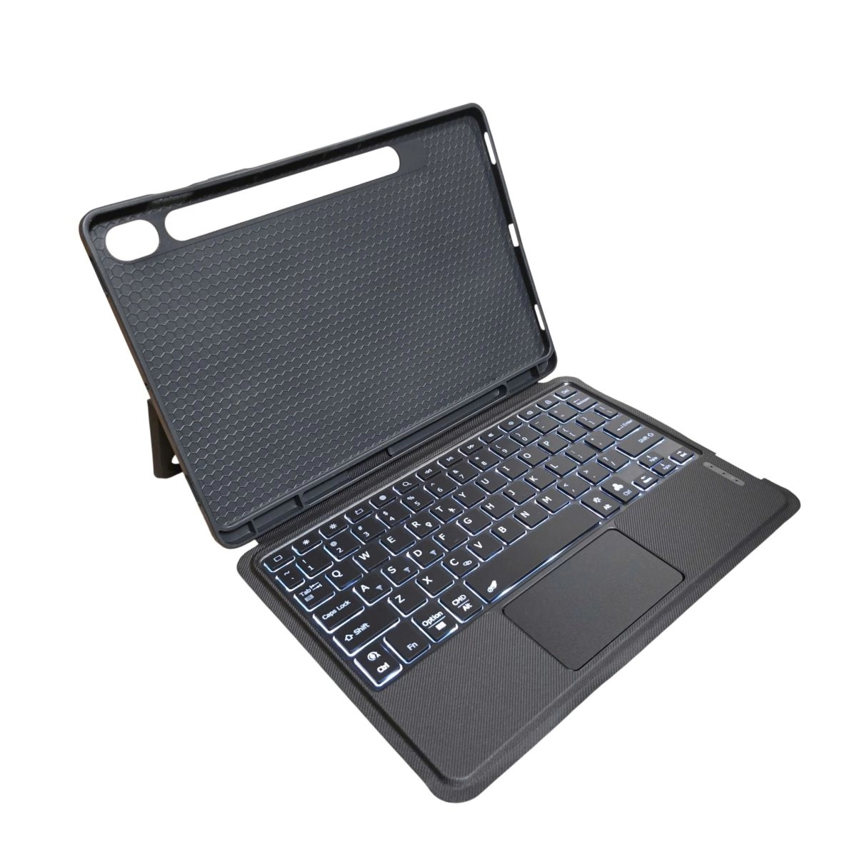 8. Bàn phím bluetooth Samsung Tab S9 FE được tích hợp đèn nền backlight phát sáng dưới phím bấm, đèn với 3 mức chỉnh độ sáng và 7 màu sắc để chuyển đổi, bạn có thể tùy chỉnh thay đổi màu sắc dưới phím bấm, ánh sáng dưới bàn phím giúp người dùng thuận tiện khi sử dụng trong đêm tối (lưu ý, khi sử dụng đèn nền phím thì tốc độ tiêu thụ điện năng trên pin sẽ bị tăng thêm, do vậy bàn phím sẽ nhanh phải sạc lại pin).
