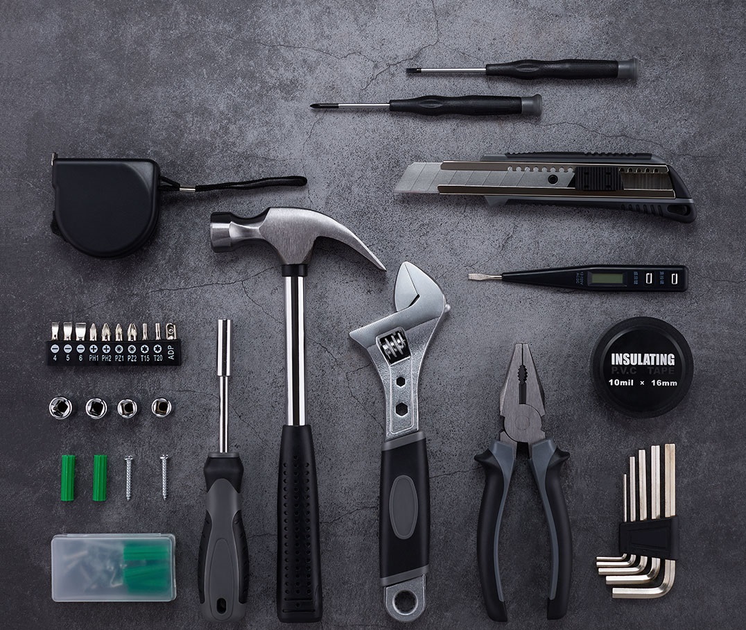 Trong hộp gồm có: búa vuốt, cờ lê điều chỉnh 20cm, ống đa năng 7-10mm, thước dây 3 mét, hộp phụ tùng, cờ lê lục giác, máy cắt dây, lô đầu 10 cái, chữ thập, dao tiện ích, bút điện kỹ thuật số, tuốc nơ vít 3mm